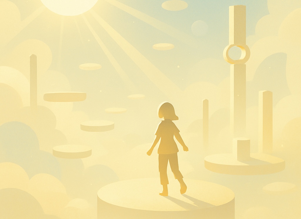 A vast plain wrapped in white mist, particles of light drifting in the air, the faint sound of footsteps in the distance—it feels as though they belong to me, yet somehow they seem like someone else’s memories. There’s something familiar in it, and at the same time, I fall into the illusion that I myself am beginning to blur.